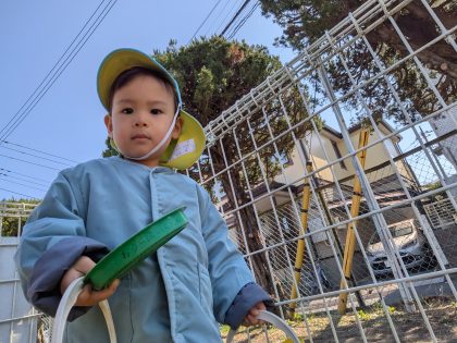「ぼくは、バケツを2つ持って何を作ろうかな?」