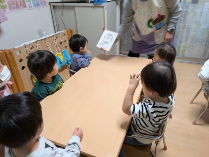 ちゅうりっぷ組さん達が、絵本📖「ひょうたんこーろころ」の 背表紙を見ているところ<^!^>