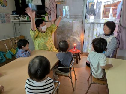 ⤵の写真 何と今日は、K先生○○歳の誕生日‼ ちゅうりっぷ組の○○くんが、ろうそくを消すのはK先生❗と一言‼‼(何て優しいのでしょう(*゚∀゚)