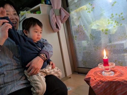 おはなし「さんびきのやぎのがらがらどん」 のあと、♪おさらにたまごにはしかけほいのじゃんけん勝負で勝ったお友達。願い事を聞いて、ろうそくの灯を吹き消してもらいました。