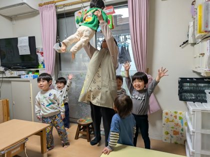 ↓の写真 ♪ずくぼんじょ の最後にすっぽーんと抜く歌の調子に合わせて、引っこ抜いた子ども達(^▽^)/