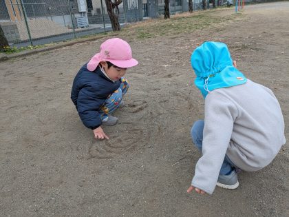何を描いてるんでしょう? 丸いのは何かなあ? 電車?それとも~ドラえもん?