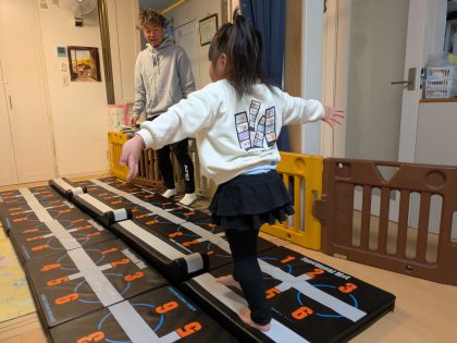 「ジャンプしてもいけないんだよ」とそっと言う○○くん 「じゃあ、みんなひとりずつ歩いてみよう」とストーンを一列に並び替えてひとりずつチャレンジしました。