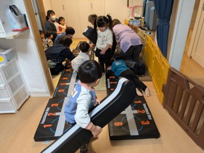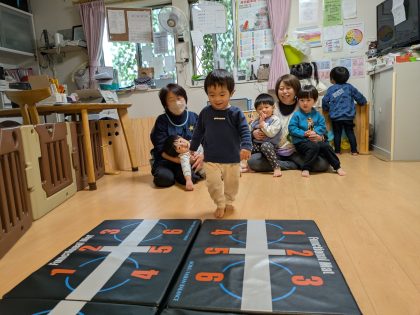 「お次はマットを並べるのをお手伝いして下さい」との問いかけに、ささっとお手伝いを始めるちゅうりっぷ組のお友達(^^)v