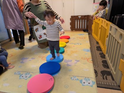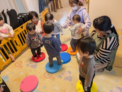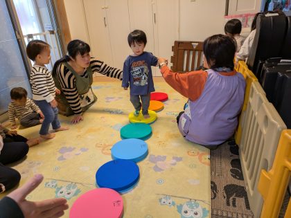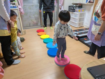 たんぽぽ組のお友達からスタート😊 初めのあいさつ後、音の鳴る円形低反発クッションにチャレンジ(^o^)