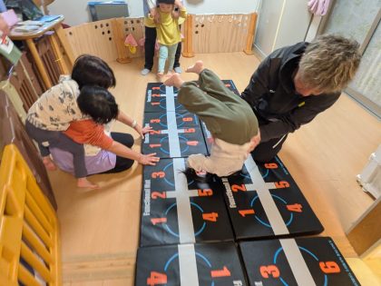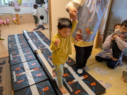 みんなで準備したマットです(^o^) 真ん中の一本橋マットをバランスを取りながらチャレンジ(^^)v