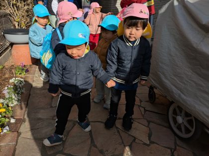 2歳児が1歳児の手をつなぎ、お散歩に出かけます(^^)v