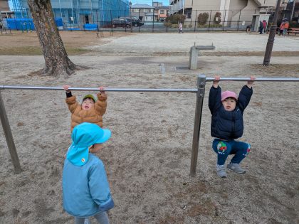 ぼくたちは、鉄棒だよ(^o^) おさるさんみたいになって、ぶら下がるよ<^!^>