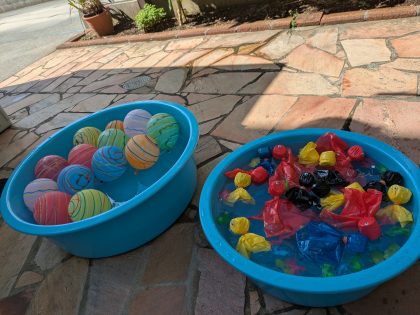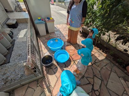 みんながすくって、なくなったね~~ 空になったおけやバケツを眺めています。
