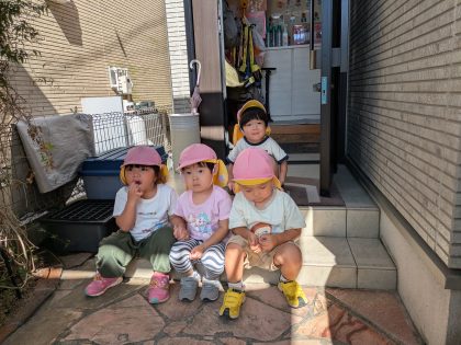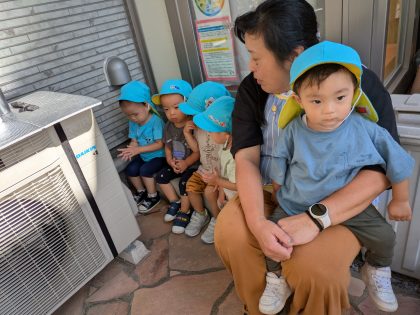 ちゅうりっぷ組さん達は、玄関前に座り、先生のお話を聞いているところです。