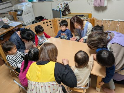 ちゅうりっぷ組さん達とたんぽぽ組さん達一緒に座って ♪ひらいたひらいた~のわらべうたを楽しんでいるところ(^o^)