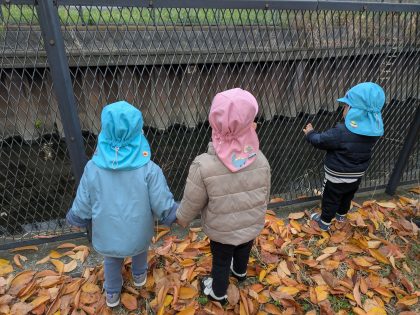 「落ち葉を川に落としてみようっと‼ お魚さん、食べるかなあ⁉」