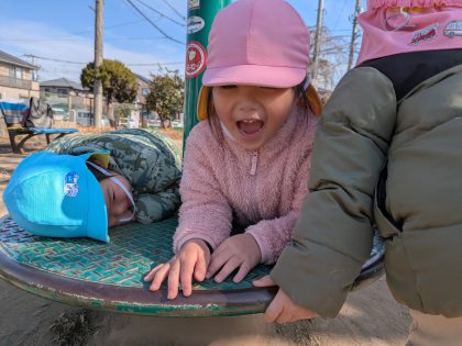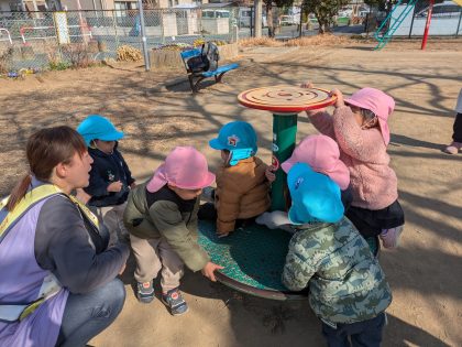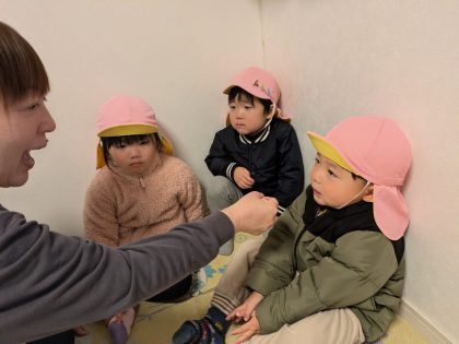 その後、戸外遊びの準備中のたんぽぽ組さん達