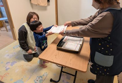 修了証書の受け取りの練習をしている場面です。先生のフォローでいい感じに受け取りができましたね(^▽^)/