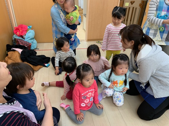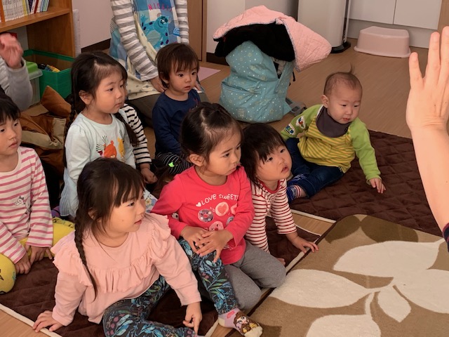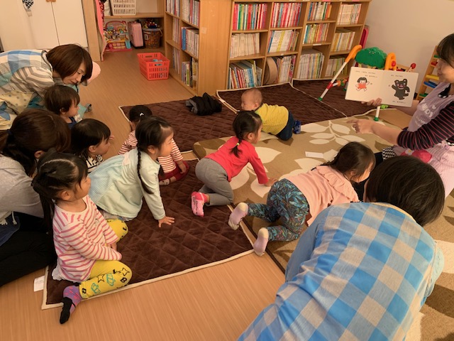 先生を待つ間、別の部屋で、絵本を見たり、手遊びやわらべうたで遊びました^ – ^大型絵本も見て楽しみました(^^)